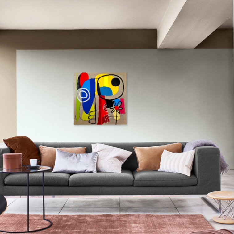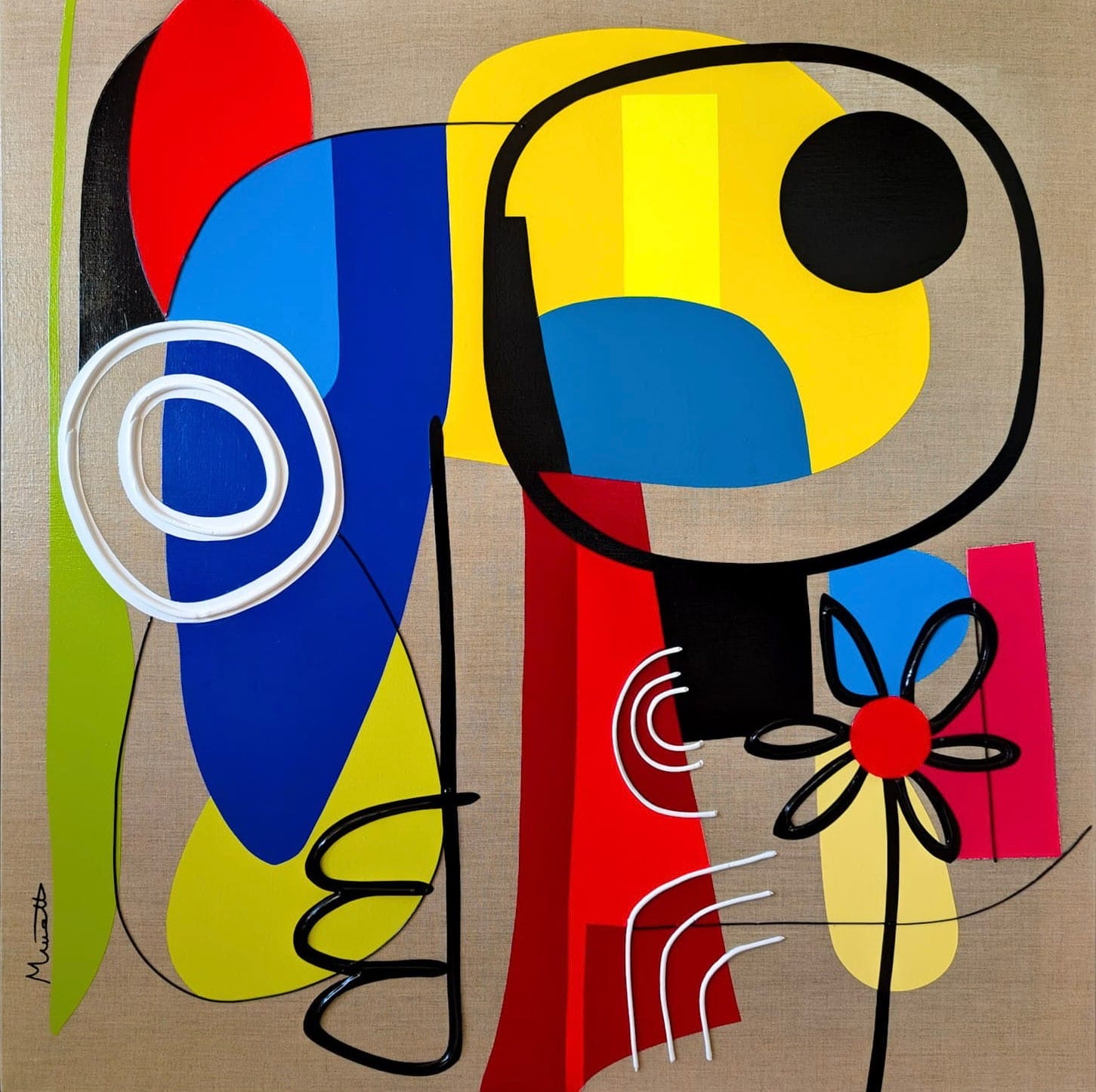Tableau abstrait réalisé à l’acrylique sur toile brut par l’artiste Muriel Matt. Une oeuvre contemporaine aux formes géométriques et aux couleurs vives soulignées de noir pour accentuer les courbes. Toile encadrée avec une caisse américaine en bois noir.