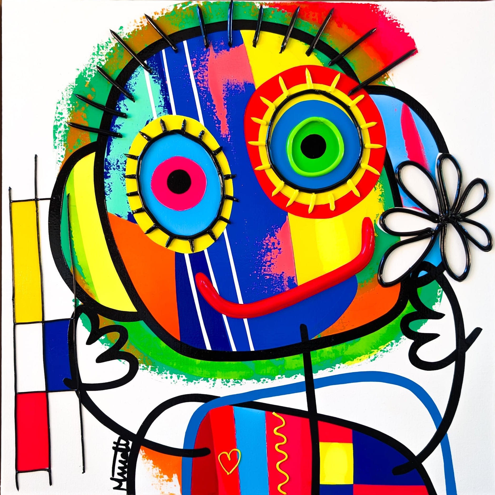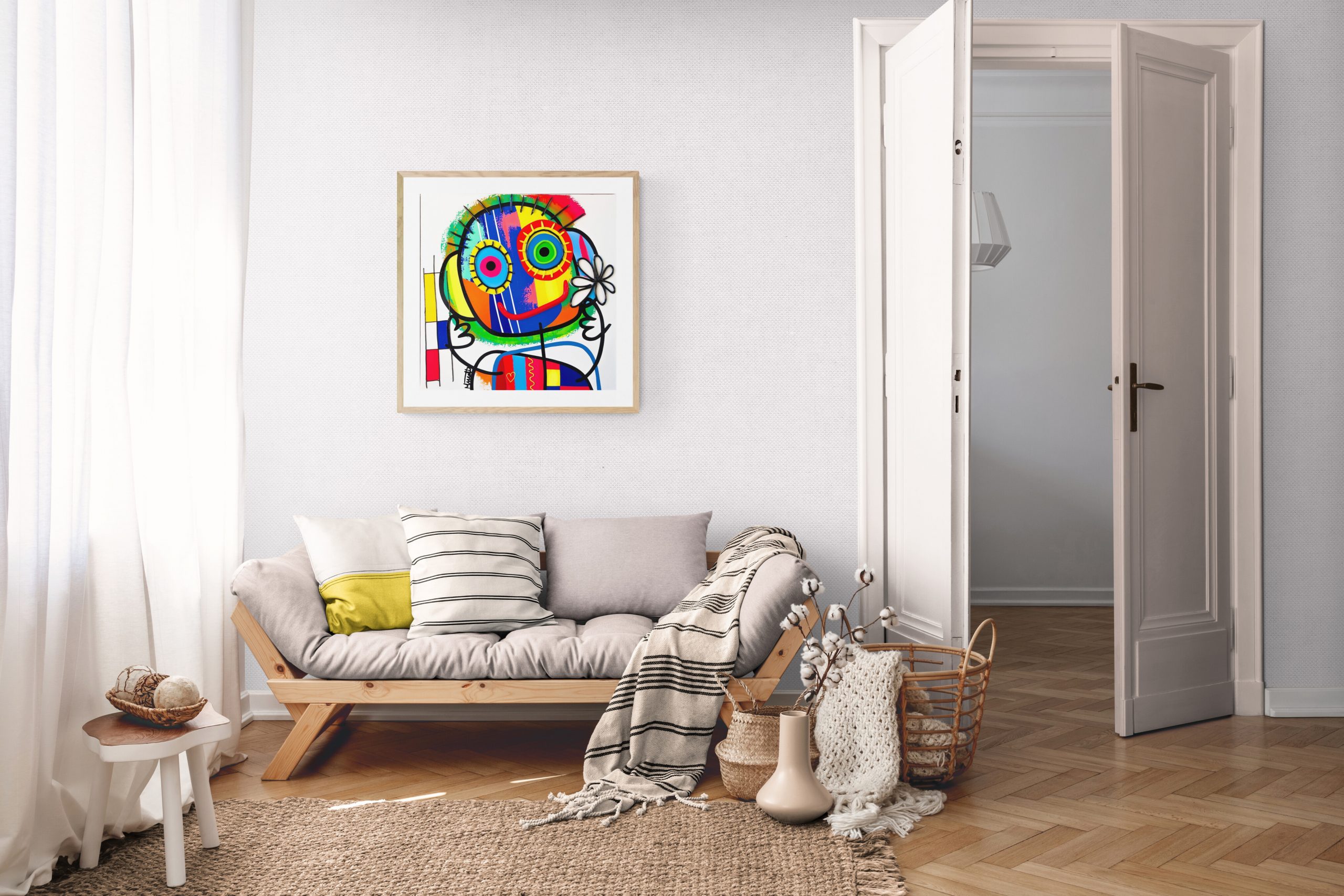 Tableau portrait réalisé à l’acrylique sur toile par l’artiste Muriel Matt. Une oeuvre contemporaine aux couleurs éclatantes soulignée de noir pour accentuer les reliefs. Tableau encadré avec une caisse américaine en bois clair.