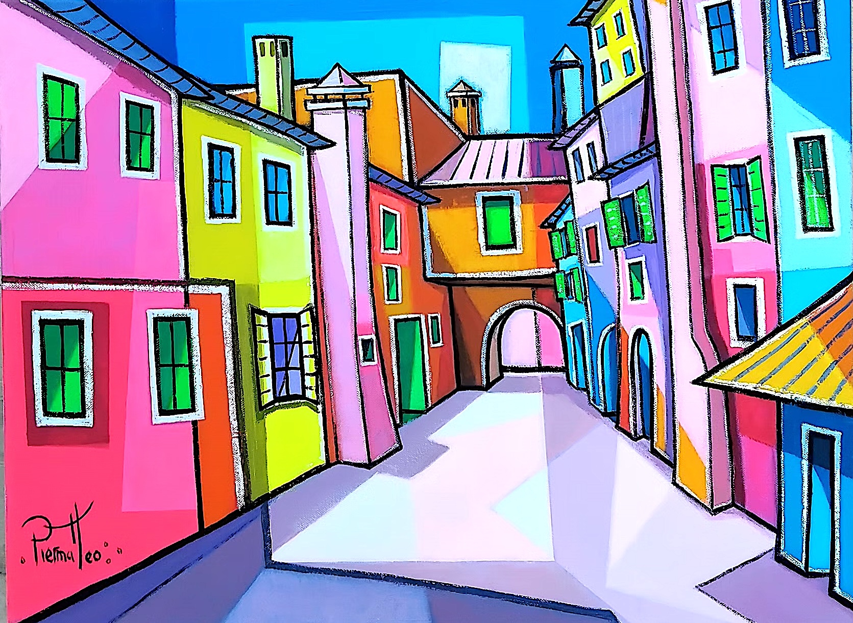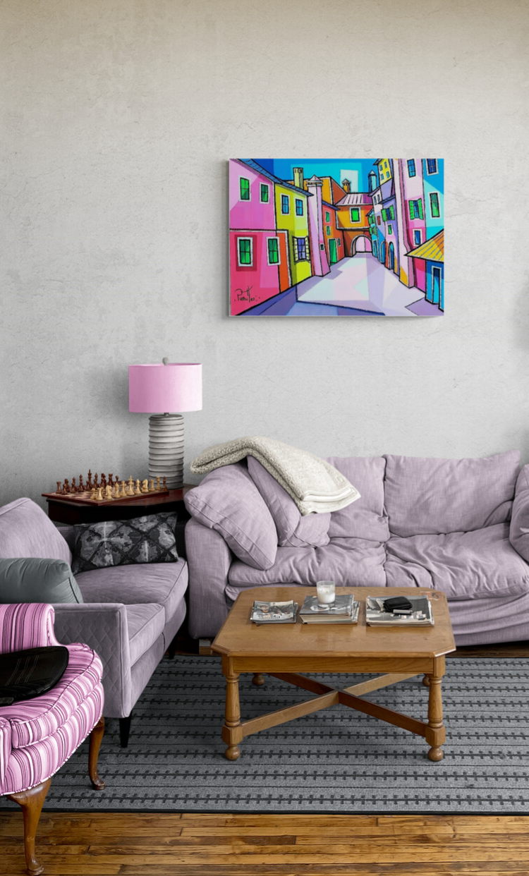 Tableau contemporain de paysage d’Italie réalisé sur toile en techniques mixtes, huile et acrylique par l’artiste Giuseppe Piermatteo. Cette oeuvre de petit format est travaillée avec des aux couleurs vives qui captent la lumière.