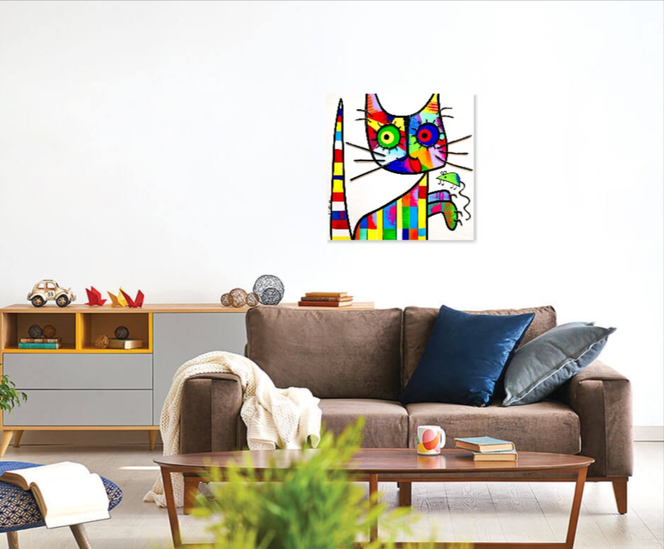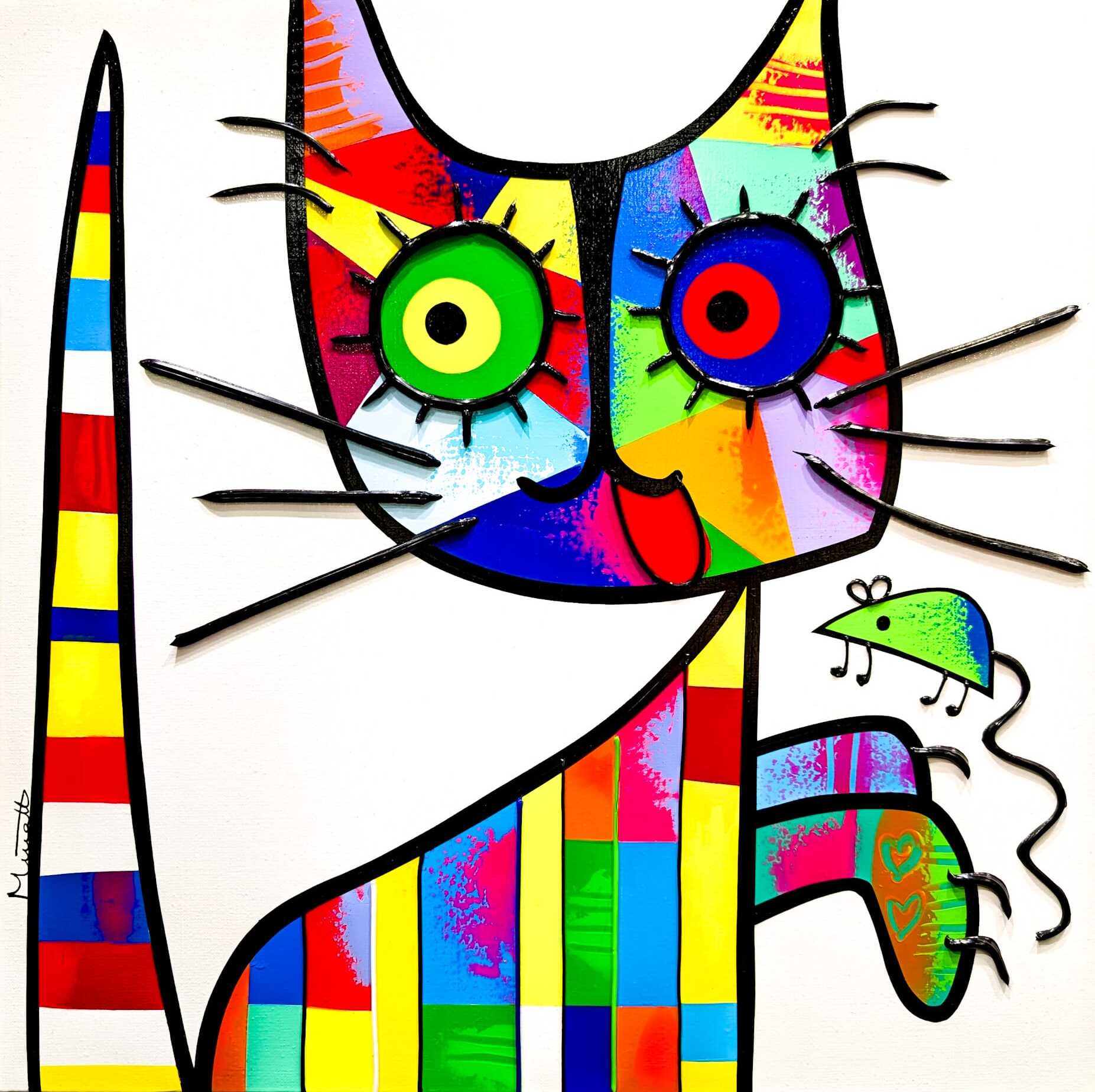Petit tableau « chat » contemporain sur le thème animalier réalisé à l’acrylique sur toile par l’artiste Muriel Matt. Une peinture aux couleurs éclatantes soulignée de noir pour accentuer les reliefs. Cette petite toile est encadrée avec une caisse en bois naturel.