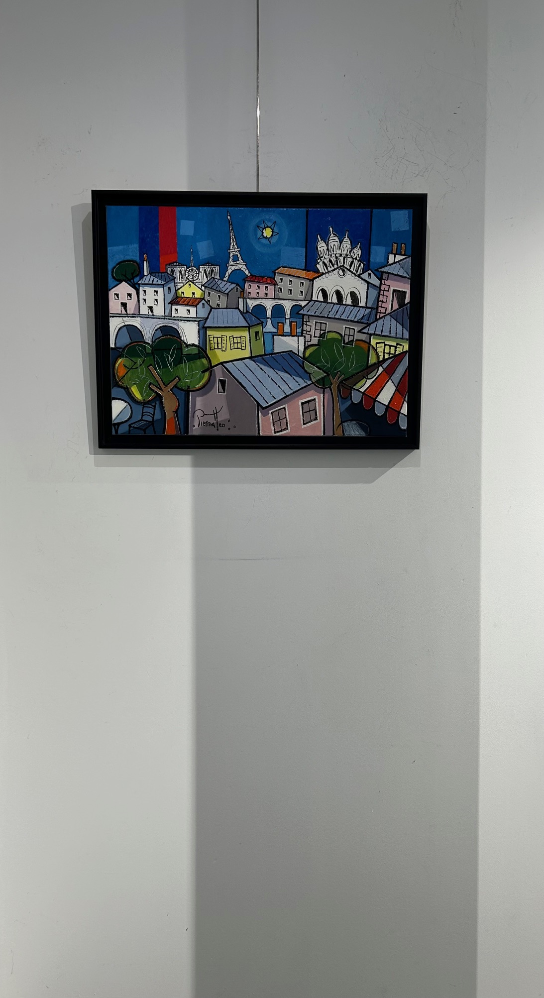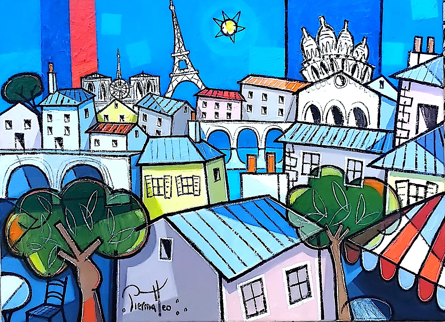 Tableau contemporain de paysage de ville réalisé sur toile à l’acrylique par l’artiste Giuseppe Piermatteo. Cette oeuvre met en lumière Paris avec vue sur la Tour Effel ou notre Dame. Cette toile aux couleurs vives et joyeuses enchantera tout intérieur.